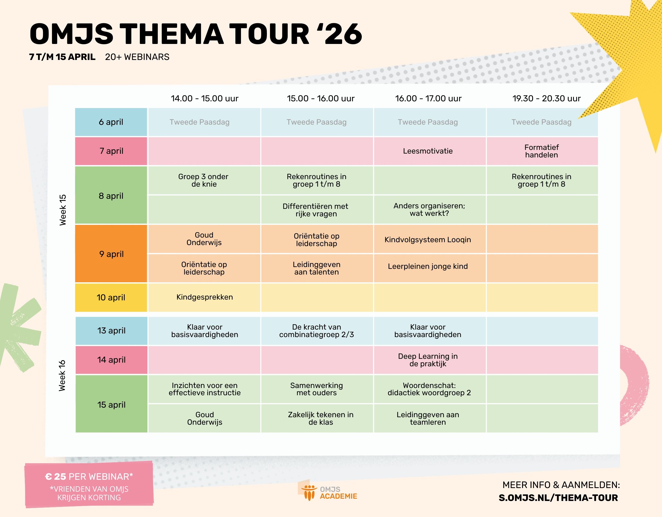 De OMJS Thema Tour vindt plaats van 7 t/m 15 april 2026. Acht dagen inspiratie door webinars met diverse thema's. Voor elke onderwijsprofessional wat wils. Tijdens dit webinar van één uur heb je je inzichten opgefrist over het leren van jonge kinderen en hoe je dit in een combinatiegroep 2/3 krachtig kunt inzetten.
