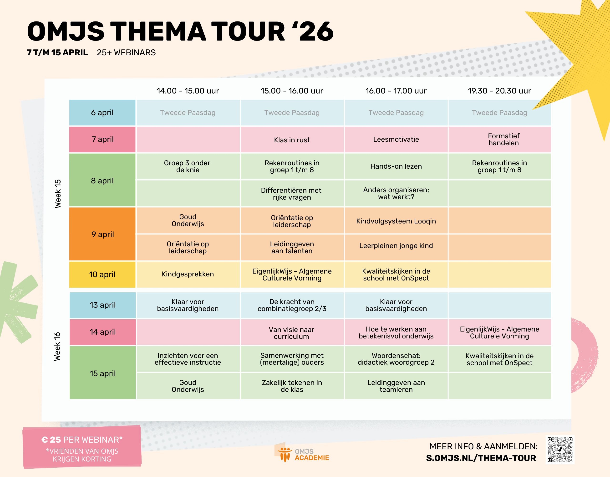 Tijdens de Thema Tour van Onderwijs Maak Je Samen staan 25+ webinars op de planning. Van 7 t/m 15 april 2026 vind je tal van inspirerende webinars waarin we samen bouwen aan sterk en betekenisvol onderwijs.