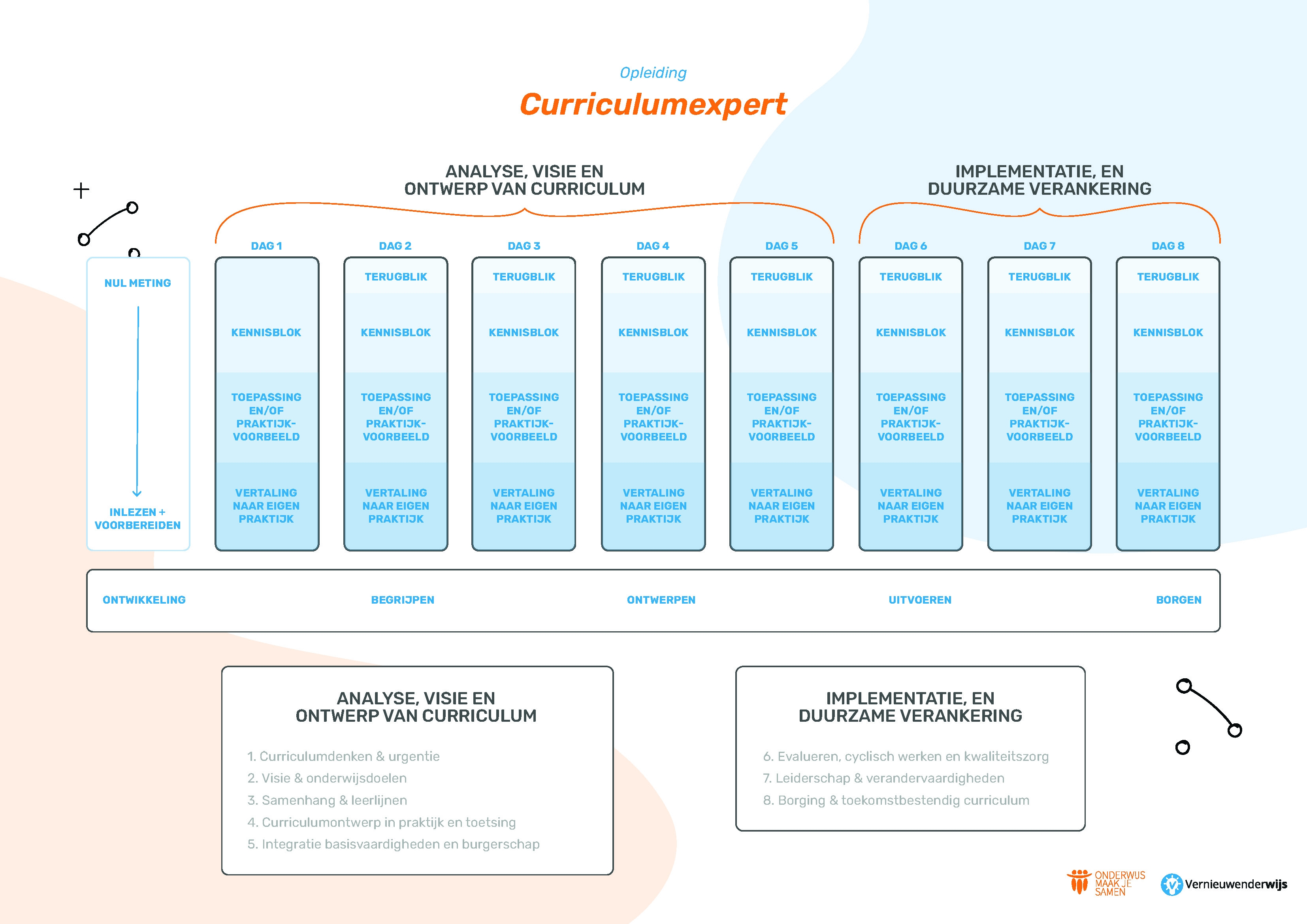 Deze opleiding is opgebouwd rond thema’s die centraal staan bij curriculumontwikkeling in de praktijk: visie, ontwerpprincipes, samenhang, evaluatie en jouw rol als curriculumexpert. In acht bijeenkomsten van een dagdeel werk je samen met mededeelnemers en met jouw eigen praktijkvraagstuk aan het ontwerpen, analyseren en versterken van een curriculum dat recht doet aan de onderwijsvisie van jouw school. Per bijeenkomst komt een kernelement uit het curriculumproces aan bod en leer je concrete tools en inzichten toe te passen in jouw context.